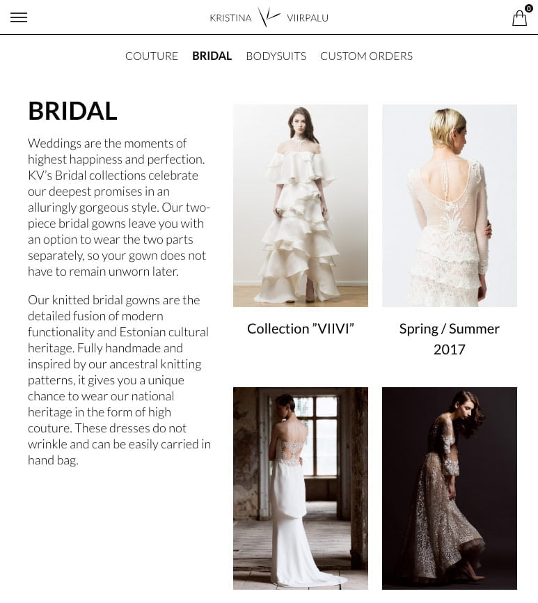 Velvet design agency did the design and Reiven Solutions developed a custom e-commerce website for Kristina Viirpalu’s fashion brand KV. On that site you can admire her beautiful creation and also buy bodysuits, dresses, skirts, stockings and much more. You can either get the ready-made product or have one specially made just for you.