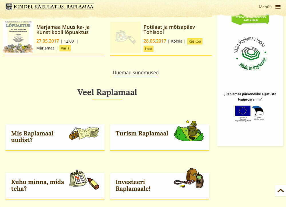Reiven Solutions did the redesign and full redevelopment of Raplamaa.ee portal. On that site visitor can get all the facts about Raplamaa, read all the news, check out events coming up in different places and find places to stay, eat, do sports, sightseeing and much more. This is definitely not the final version of it and this portal will be always growing and evolving.