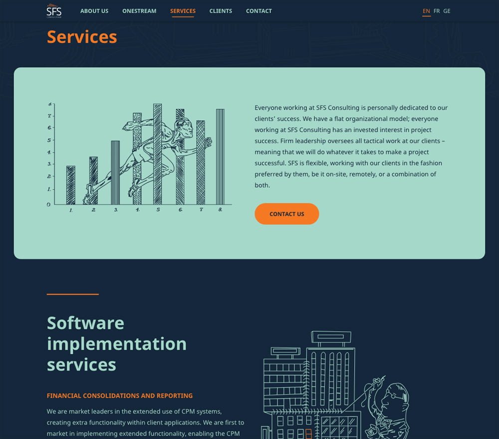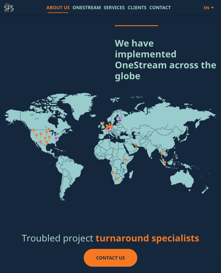 SFS Consulting (Shell Financial Systems) on rahvusvaheline juhtimiskonsultatsiooni firma, mis pakub strateegilist nõustamist ja tarkvara juurutamise teenuseid. Reiven Solutions arendas veebilehe, kus kogu nende teave on kergesti loetav ja ilusalt illustreeritud.