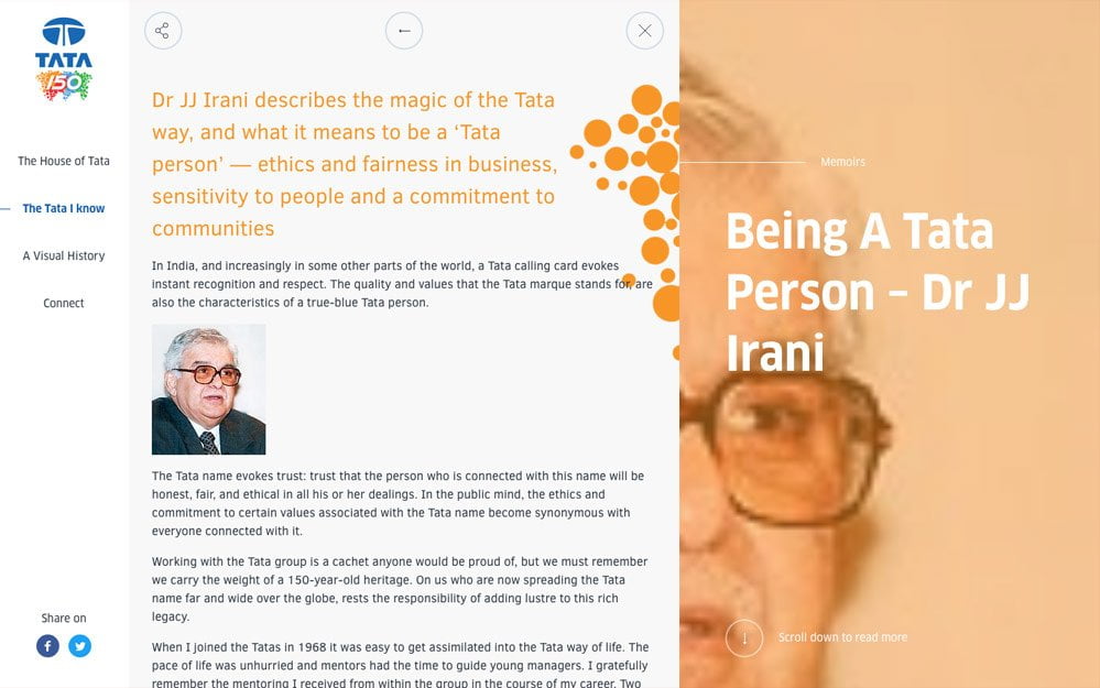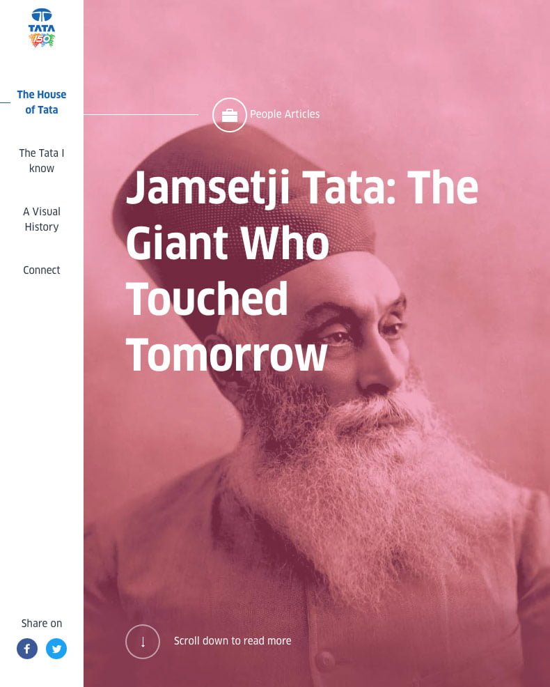 Tata Group tähistas sel aastal oma 150. sünnipäeva ning selleks puhuks lõime ülevaatliku veebilehe. DUX oli vastutav disaini eest ja Reiven Solutions tegi kõik toimivaks. Lugege artikleid nende arengust globaalseks ettevõtteks, tutvuge teiste inimeste arvamustega Tata Groupi kohta ning vaadake kõiki nende märkimisväärseid saavutusi 150 aasta jooksul.