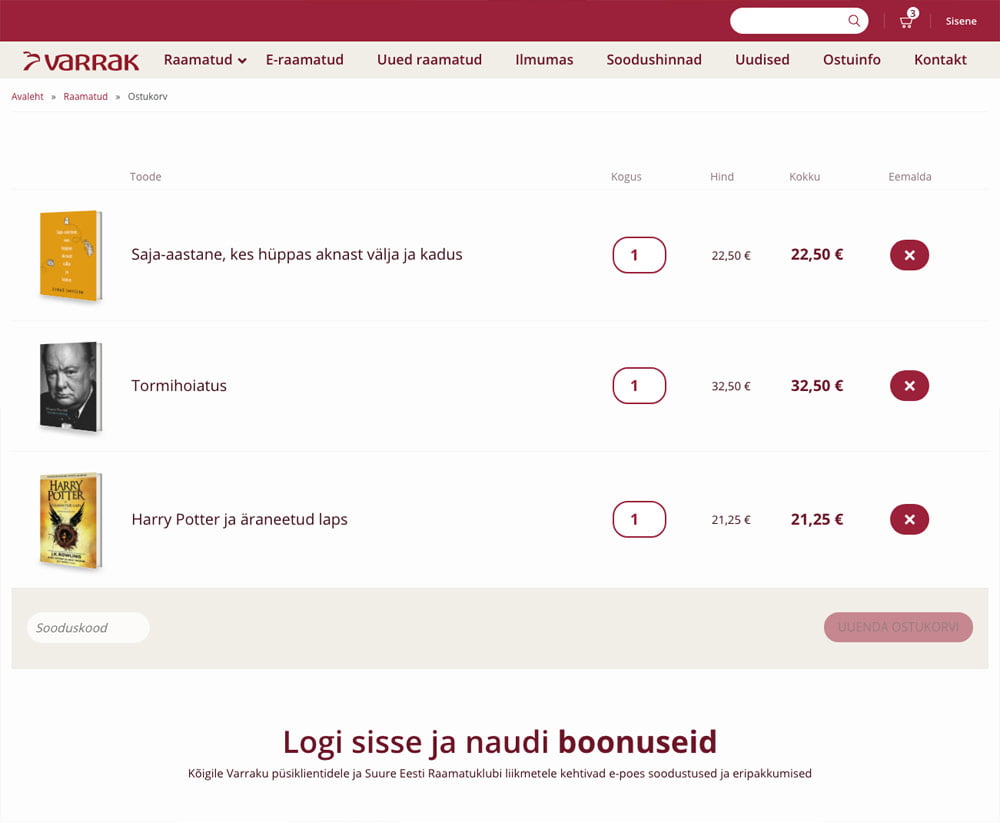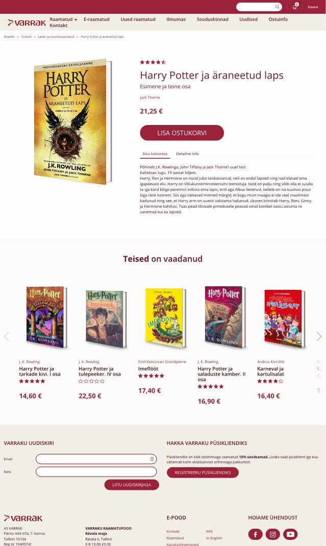 Varrak on üks populaarsemaid raamatukirjastusi Eestis, asutatud 1991. aastal. Täna avaldab kirjastus nii eesti- kui ka tõlketeoseid, sealhulgas lasteraamatuid, biograafiaid, ilukirjandust, ajaloo raamatuid, audioraamatuid, e-raamatuid ja palju muud. Lõime neile uue e-poe, kus on sadu raamatuid ning mis sisaldab Suurt Eesti Raamatuklubi (SERK) integratsiooni, pakkudes liikmetele eripakkumisi ja igakuiseid tellimusi. See uus e-pood on välja töötatud keerukate integratsioonidega, hõlmates laohaldust, arvete haldamist, sünkroniseerimist ja erilahendusega majutusteenuseid, mis tagavad sujuva ja tõhusa kasutajakogemuse.